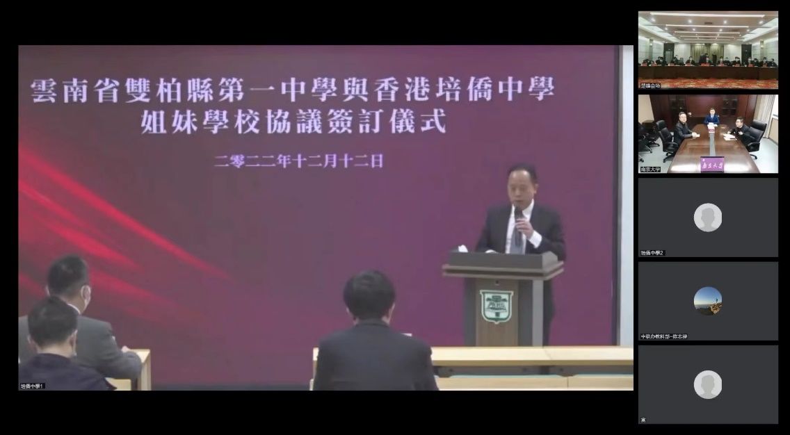 To enhance the assistance and support in education in underdeveloped regions, NJU actively promotes a sister school partnership between No. 1 High School of Shuangbai in Yunnan Province and Pui Kiu Middle School in Hong Kong Special Administrative Region. On the afternoon of December 12, the online signing ceremony of a sister school partnership between the two schools was held simultaneously in Nanjing, Chuxiong and Hong Kong.